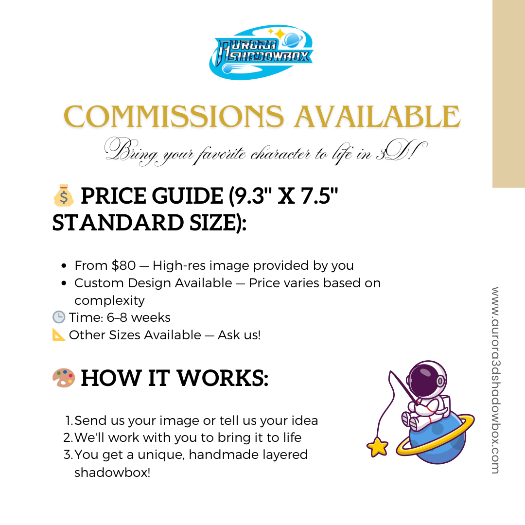 If you’d like us to design the artwork based on a character you provide, pricing will vary depending on complexity and detail level.
